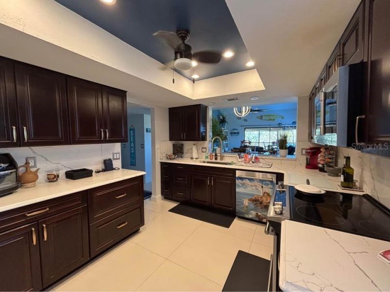 Check out this top-floor corner unit in the golf course community of Forestbrook which offers panoramic views and an abundance of natural light. This home features 16-foot vaulted ceilings in the living room and 32x32 beige polished porcelain tile floors throughout. Another great feature is the updated chef-inspired kitchen which features dark cherrywood cabinetry, quartz countertops, and a full quartz backsplash and complete with an 11-bottle wine rack and built-in wine cooler. The primary bath was totally updated with a new shower, a new vanity and a double wide linen closet. The guest bathroom has been updated with a brand-new shower, vanity and shiplap walls. The extra large primary suite includes a massive walk-in closet with custom shelving. Additional storage space is provided in the form of two exterior storage closets. Enjoy the beauty of golf course living, as well as access to a community pool, covered parking space, and an elevator. Located just minutes from downtown Largo, Largo Central Park, Highland Recreation Center.